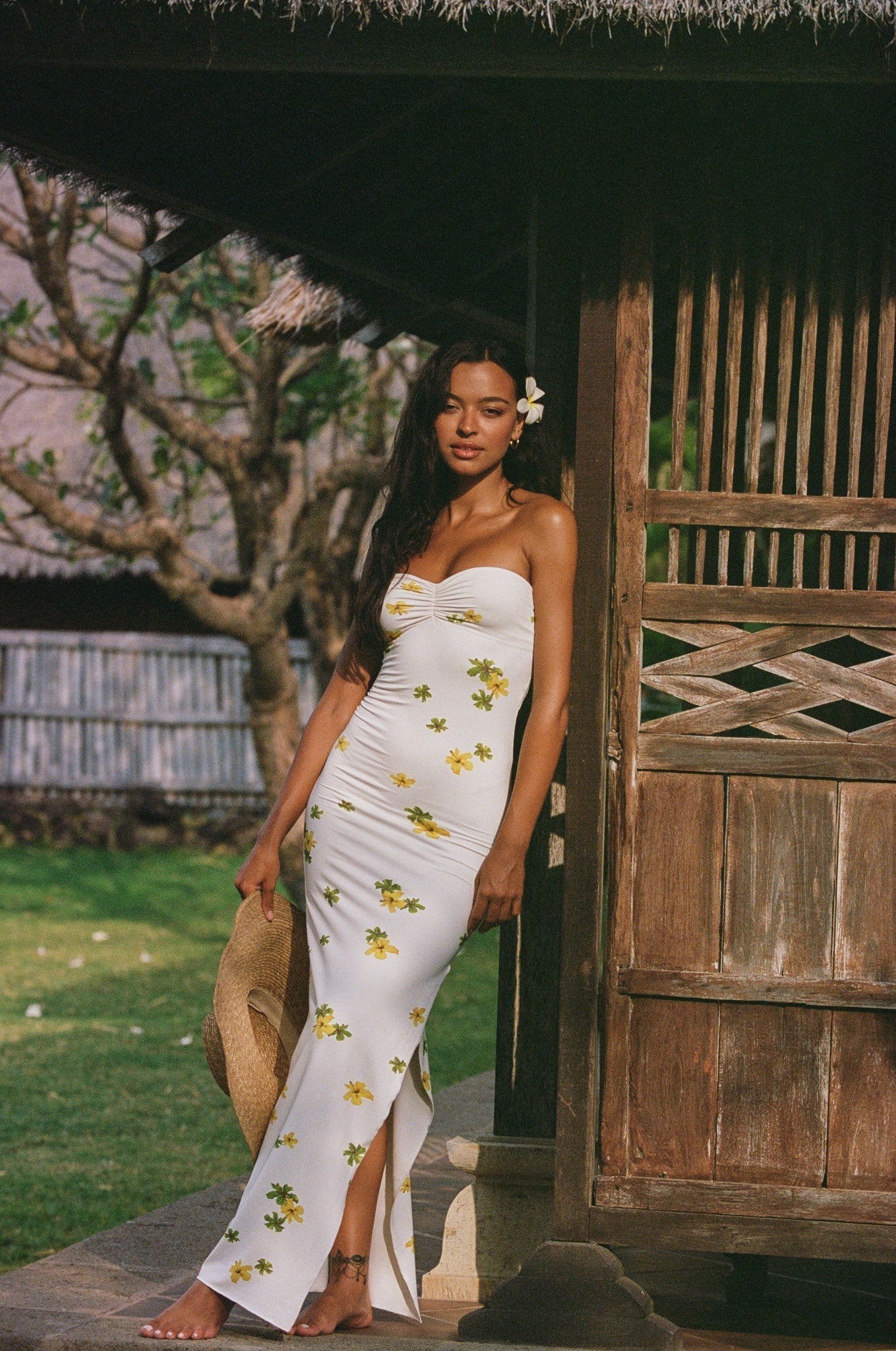 AURISTELLA Maxi Dress – a delicate tribute to effortless summer beauty. This strapless silhouette hugs your figure with grace, while the soft white backdrop blooms with scattered yellow and green florals, echoing the warmth of golden afternoons.